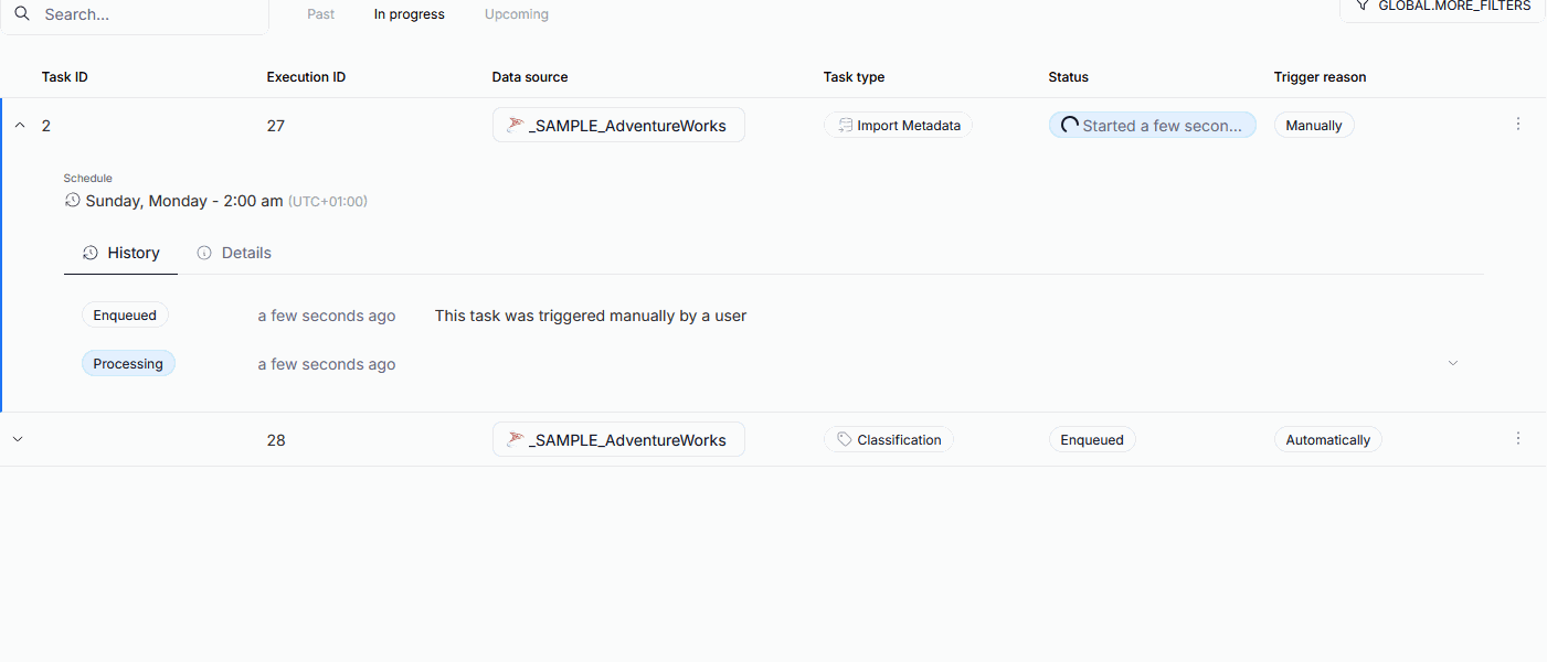 Tasks are grouped by execution ID. You can also search by Data Source name.