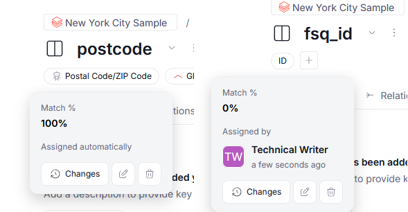 Hovering over a Semantic Type badge, shows the match percent — how much of the tested data sample matched the Semantic Type assignment rules.