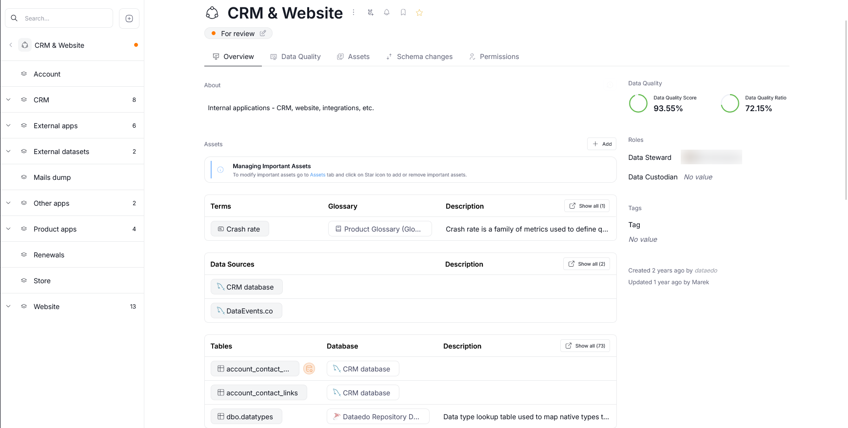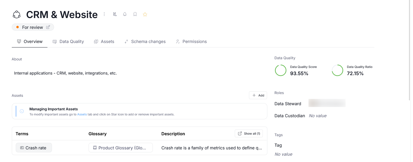 If assets for which Data Quality can be calculated are included in a Domain or Area, you will see the aggregated Data Quality score and ratio in the upper right corner. There are few special rules regarding this feature, read more in the dedicated article.