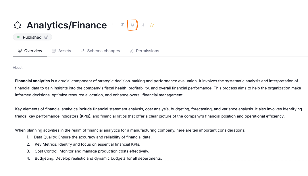 You can click the bell icon next to a name of a Domain or an Area to subscribe to notifications. This will make it, so that you receive notifications regarding changes and updates to all Assets linked to that Domain, as well as changes to the Domain itself (like a new Owner, or a change in description).