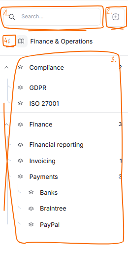 When you open a Domain or an Area, a sidebar will appear. This sidebar contains a search bar [1] and an add button [2] allowing you to create new Domains/Areas. The sidebar also shows the structure of your currently opened Domain which can be further inspected by expanding the nodes [3], and features a back arrow [4], which allows you to quickly return to a view of all Data or Business Domains in your repository (depending on what type of Domain you are currently viewing).