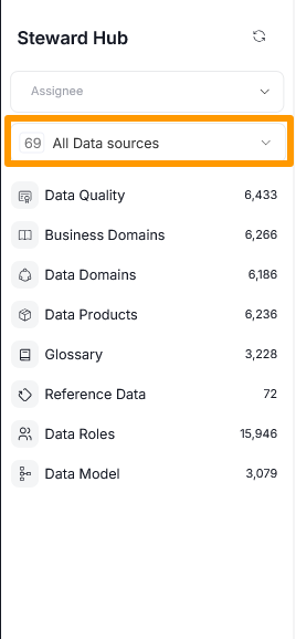 Using the sidebar, you can filter suggestions by data source. This is useful when you want to focus on documenting only a part of your Data catalog. When you click the Data Sources bar, you can select Data Source(s) you want to include in your filter search. Suggestions are shown only for the selected sources. By default, all sources are selected.