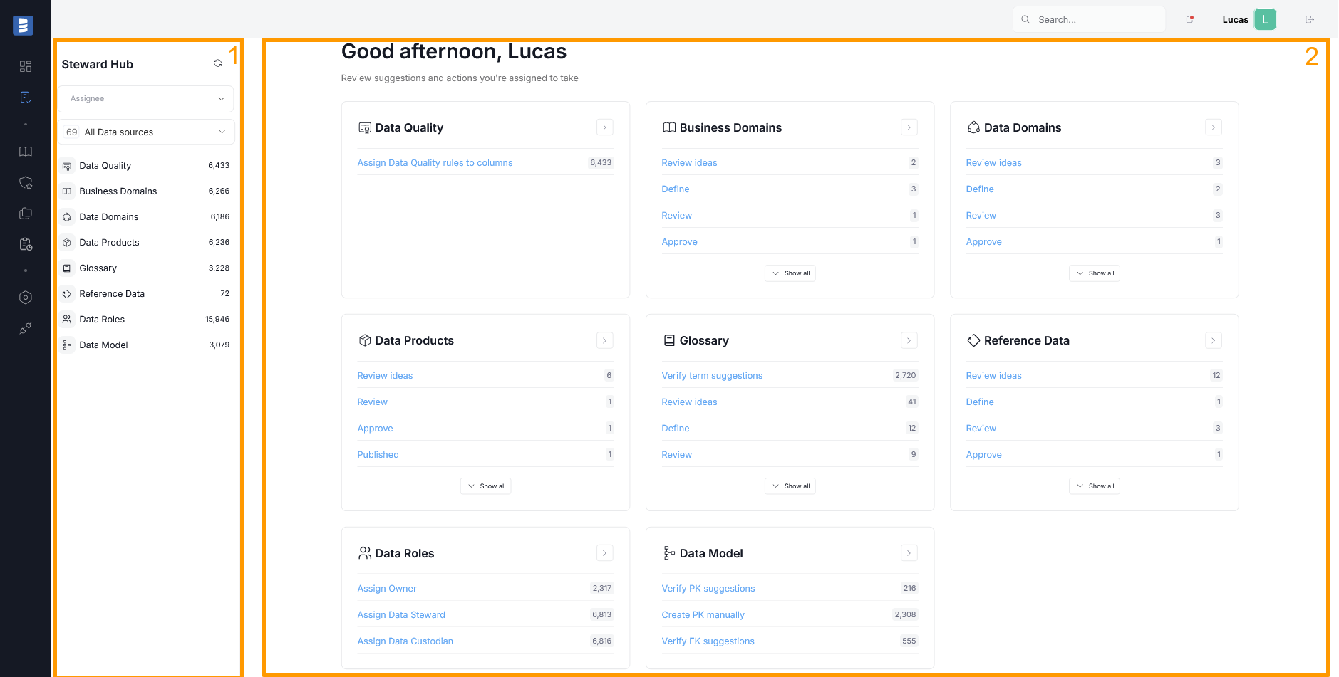 In the main section of the Steward Hub, you can see up to eight modules corresponding to crucial areas for proper data documentation and data governance - Data Quality, Business Domains, Data Domains, Data Products, Glossary, Reference Data, Data Roles, and Data Model. Each of these modules contains a list of suggested actions. The suggestions are created and shown dynamically based on the state of your repository, and your User Role.