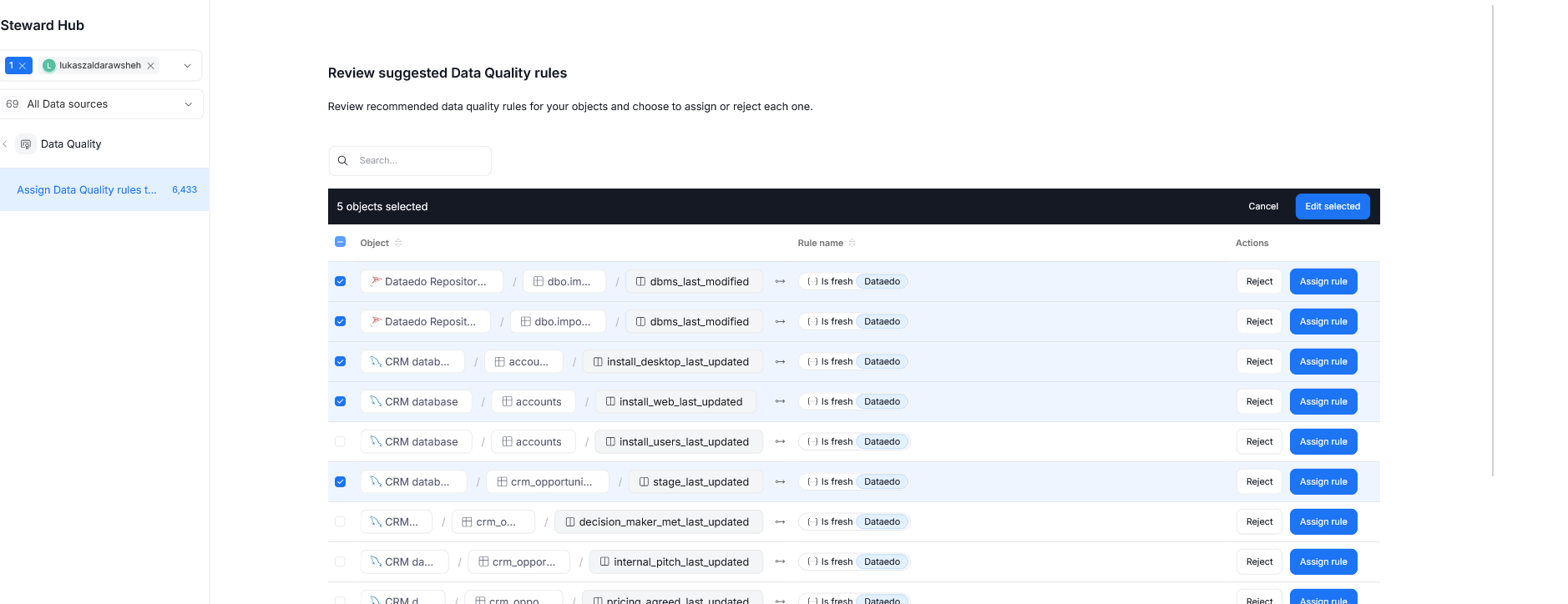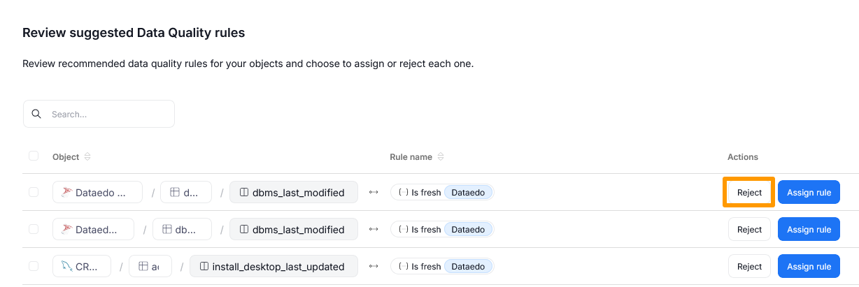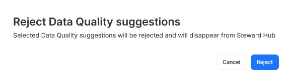 It is possible to reject multiple Data Quality rule suggestions at once. To do so, mark all of the suggestions you want to reject using Checkboxes and click Edit Selected. A pop-up will appear, asking you to confirm whether you want to reject the selected suggestions.