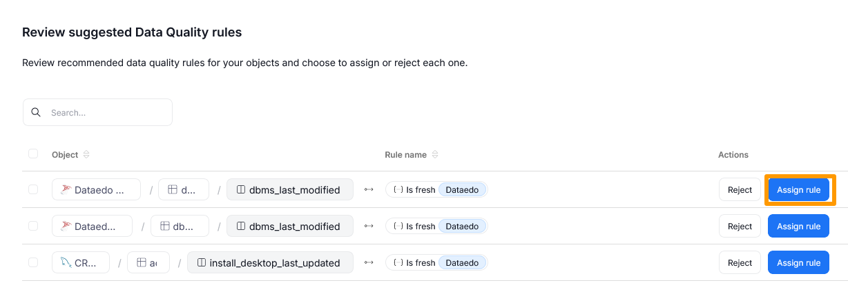 Upon clicking the Assign Data Quality Rules to columns text, you will see a table showing the columns and their suggested Data Quality rules. The suggestions are based on column names, and their match with Data Quality rules available in Dataedo.