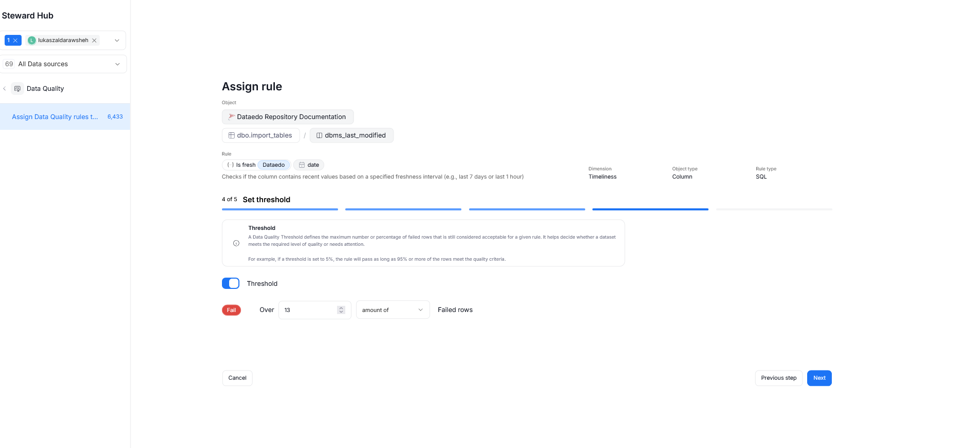 The next step is determining threshold - an optional parameter, determining how many rows (defined as an integer or percentage) can fail a Quality Check before failure is triggered.
