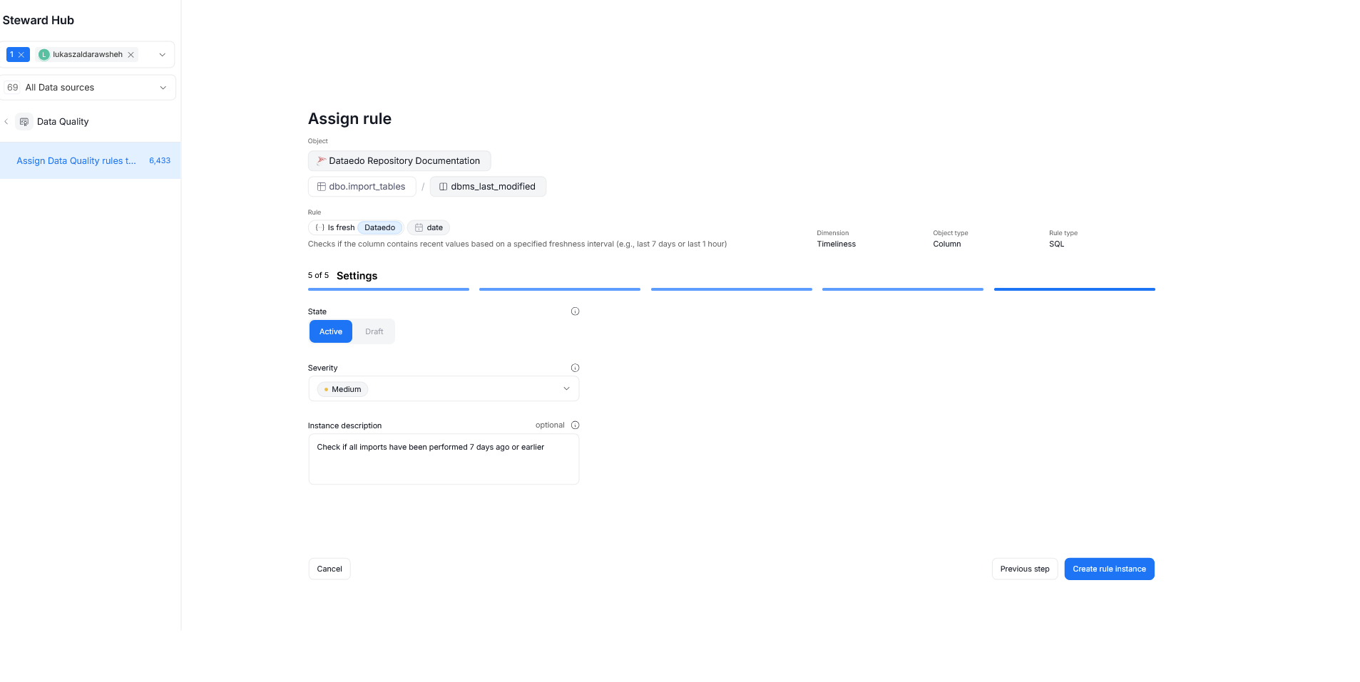 The final stage requires defining the Rule Settings which will be used by the Scheduler and when viewing Data Quality results. Once everything is configured, click the Create rule instance button to save your configuration.