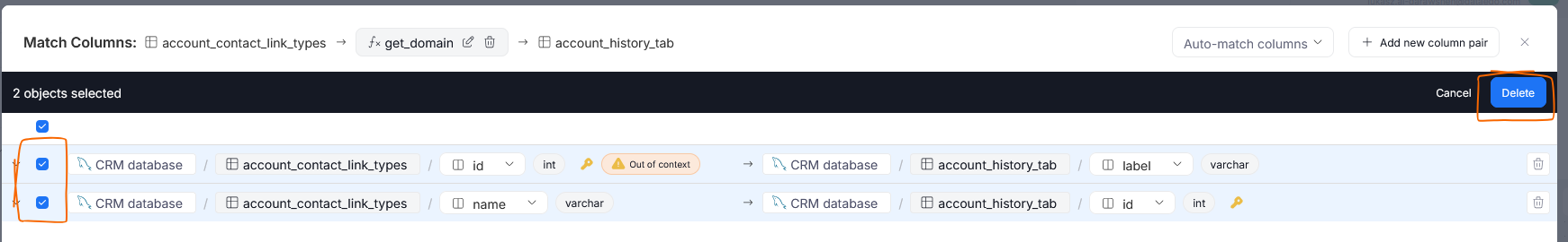 If you added a column pair by accident, or are not satisfied by a pair suggested using Auto-match, you can delete it using the trash bin icon.