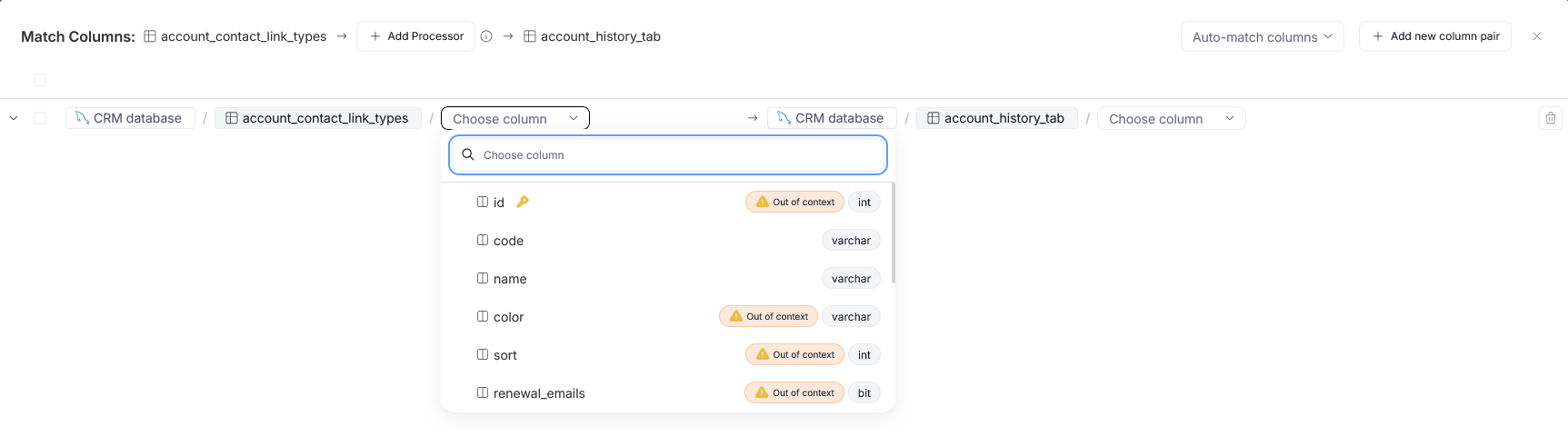 Column pairs added using auto-match will be marked with the Auto tag on the Column Matching pop-up, so you can easily identify them. However, the tag will disappear if you manually adjust their parameters.