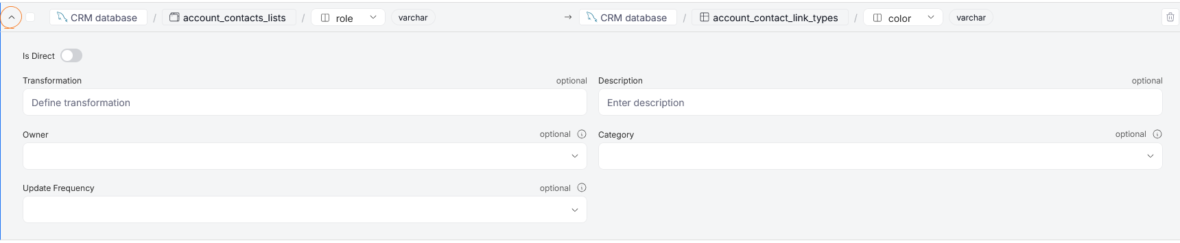 You can establish whether the connection is Direct (column is moved directly between objects without any transformations), using the is Direct toggle. You can also define the transformation between the two mapped columns, and optionally add a description to the connection. If any Custom Fields are enabled for Column Lineage, you can assign those as well.