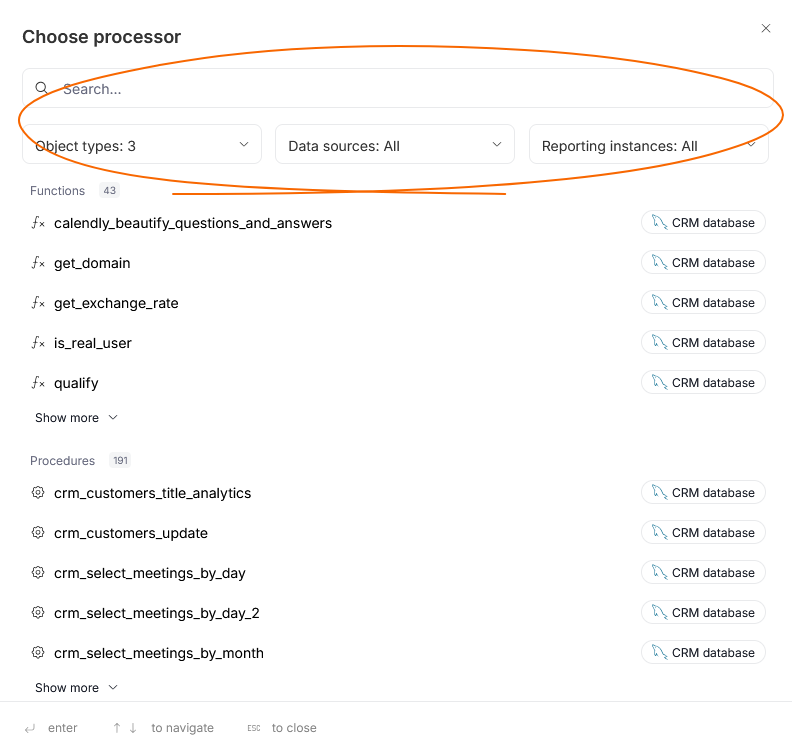 In the popup that appears, you can select which object you want to choose as a processor. You can also narrow down the options using filters or a searchbox.