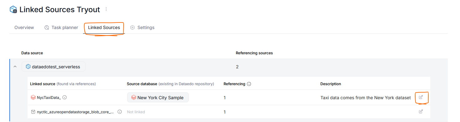 This connection can be viewed In Portal, using the Linked Sources tab of a connection. There, you can change the Database a Linked Source points to, or add a description, by clicking the edit button.