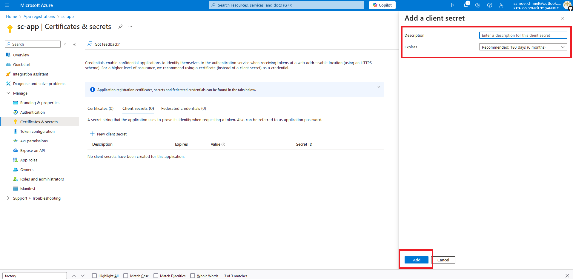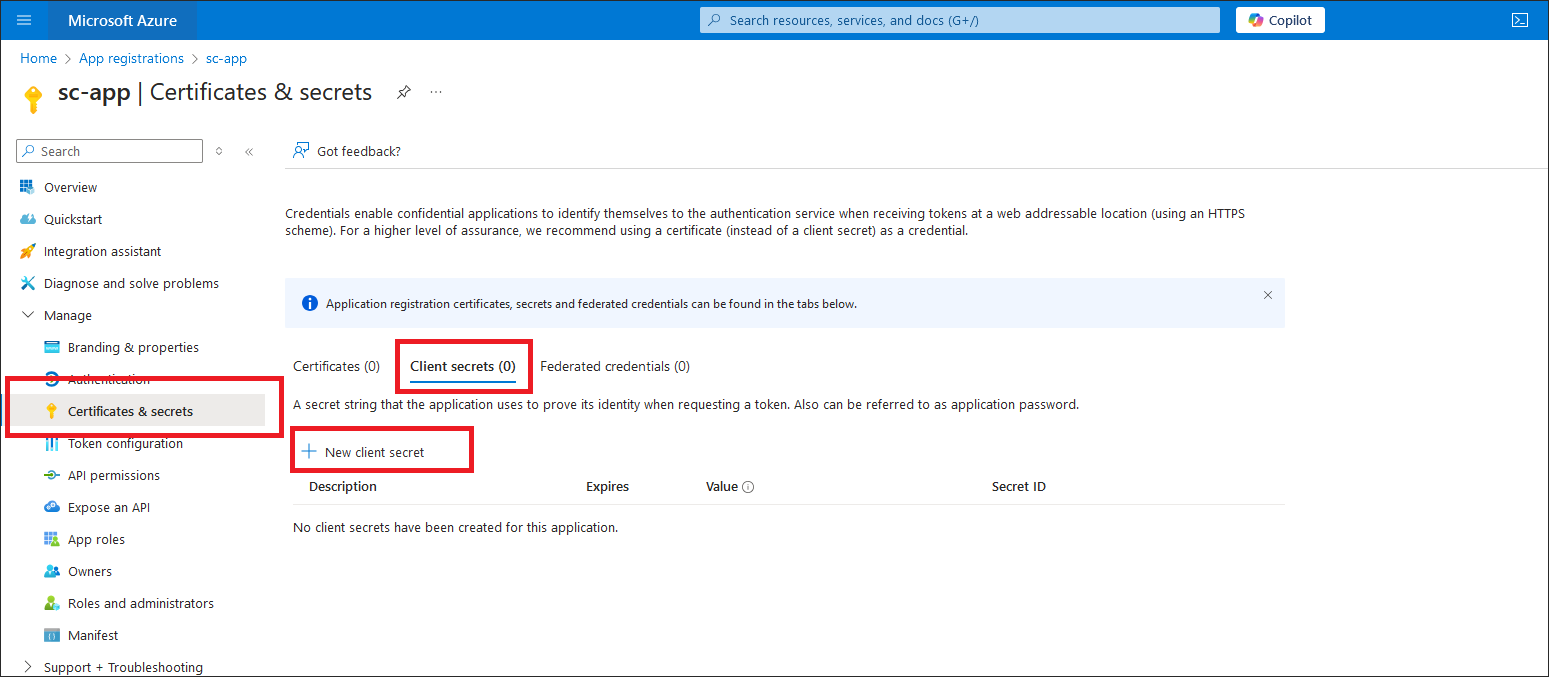 - On the Certificates & secrets page, under Client secrets, click + New client secret.