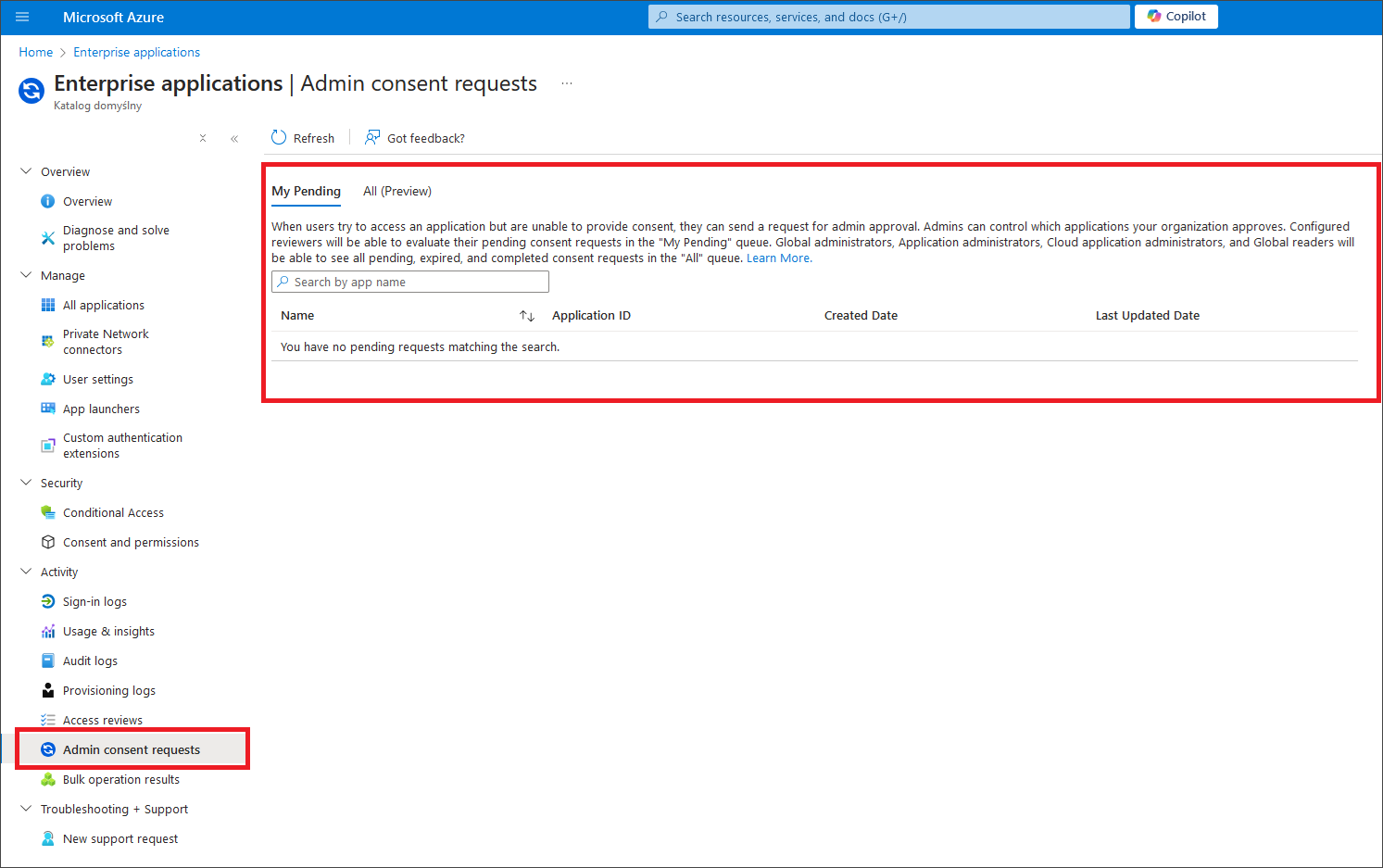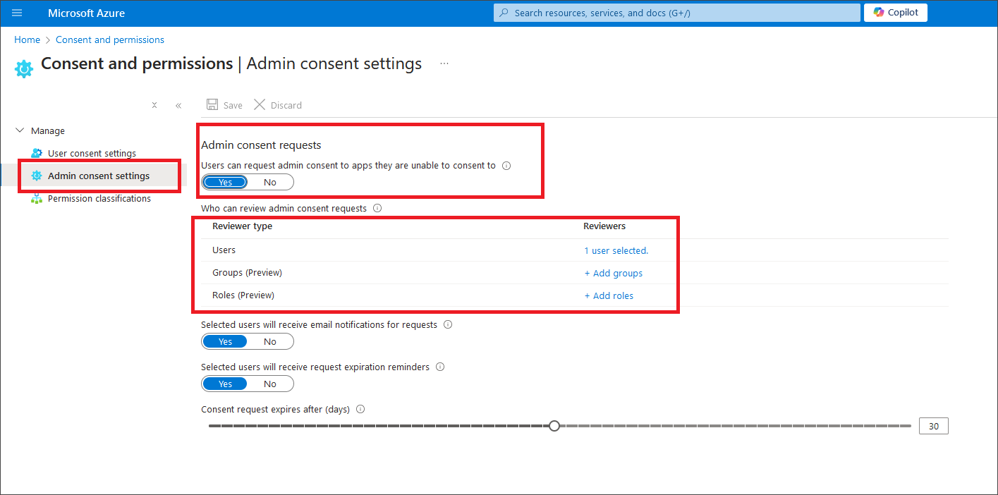 - In Consent and permissions, click Admin consent settings in the left sidebar and select YES for "Admin consent requests – Users can request admin consent to apps they are unable to consent to." Select one or more users, groups, or roles that can consent to applications.