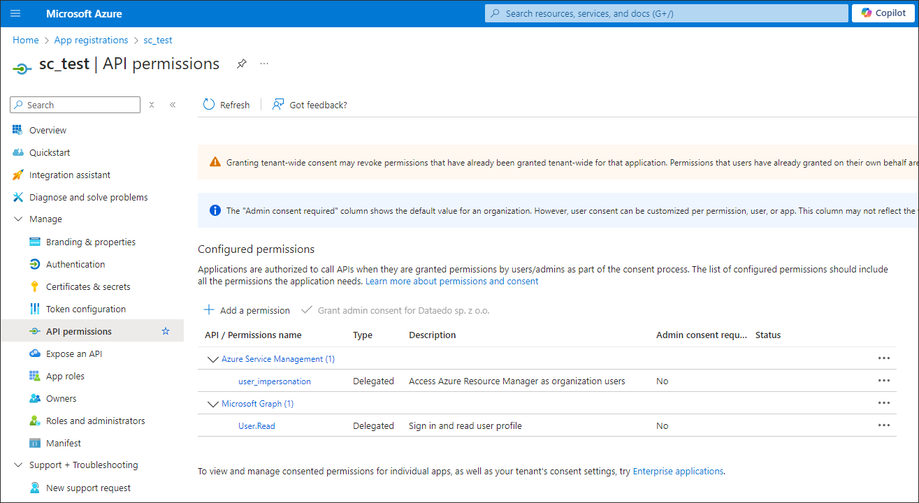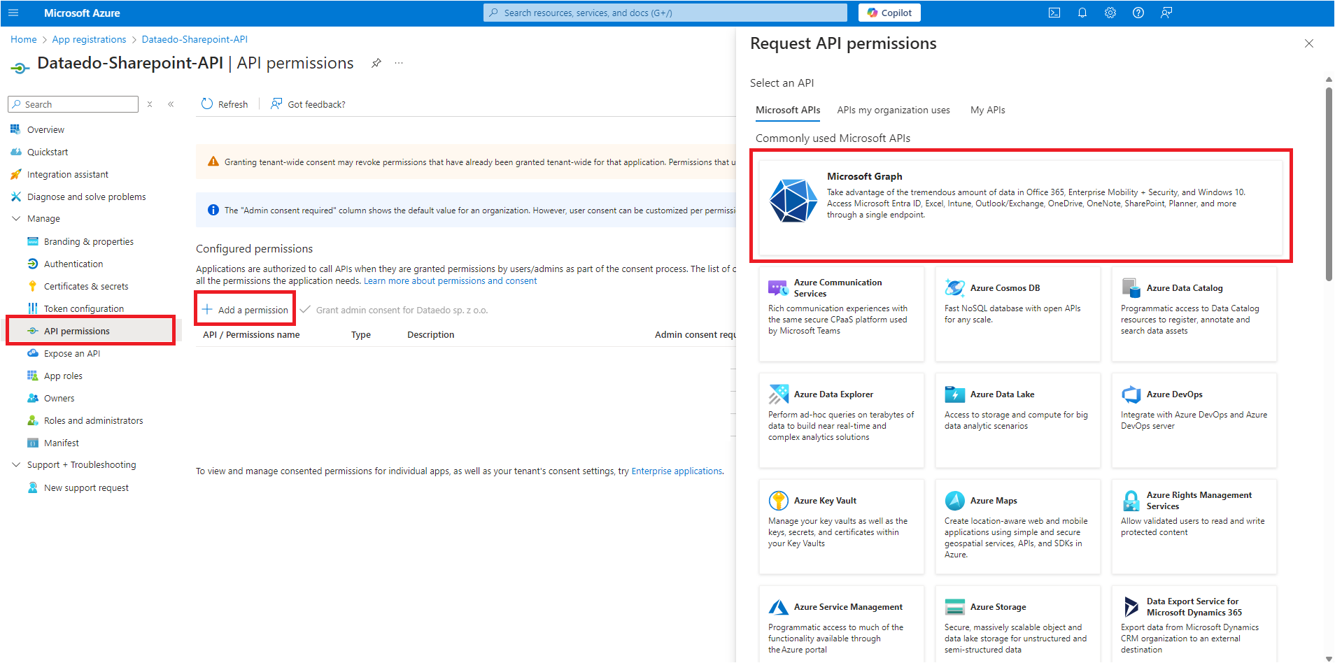 - On the left sidebar of your application page, click on Manage and then click API permissions to assign proper permissions to the application.