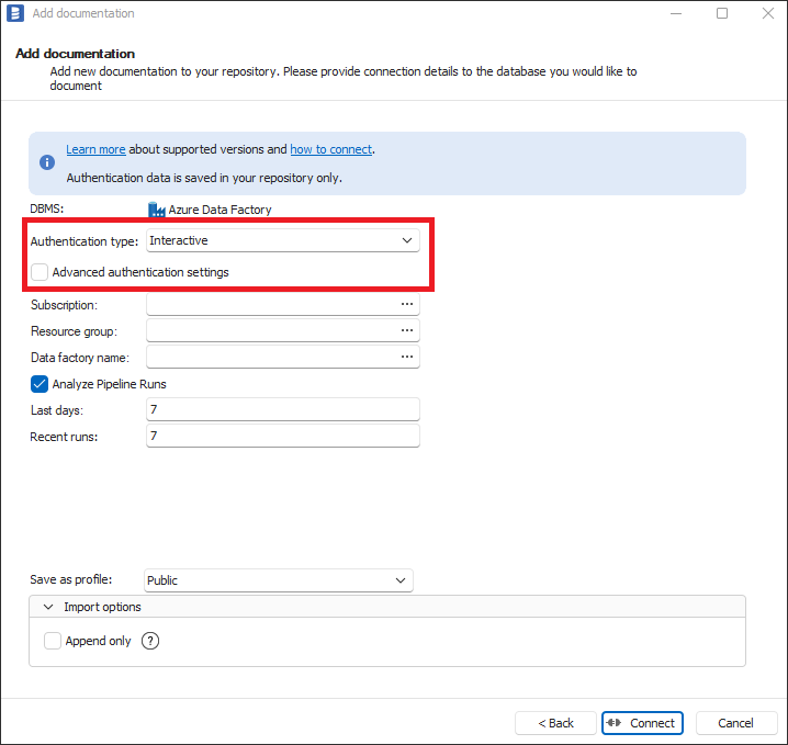 To use interactive authentication, Authentication Type dropdown should be selected to Interactive and Advanced authentication settings checkbox should be unchecked.