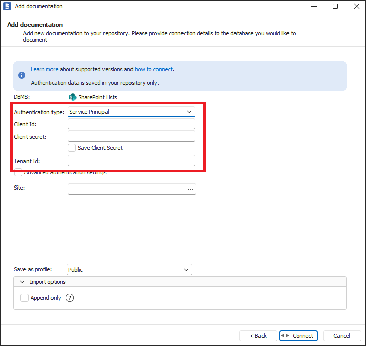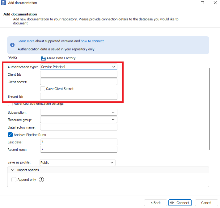 To use the service principal authentication type, please select Service Principal in Authentication Type dropdown and fill Client Id, Client Secret and Tenant Id with proper values from your Azure Application Registration. How to create Azure Application Registration and where those values available are explained in Creating Azure Application Registration section below.