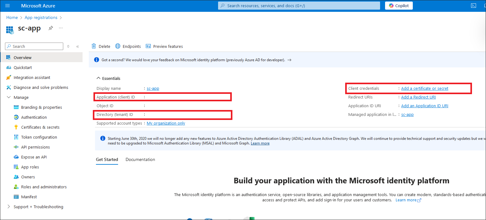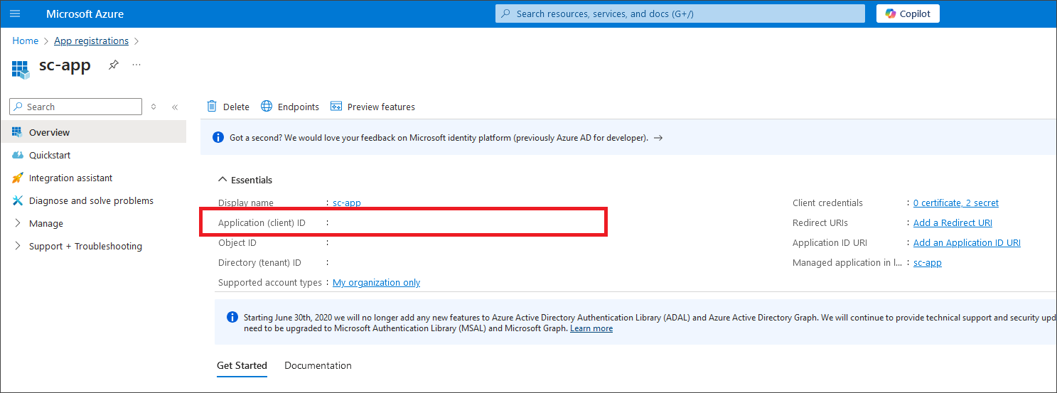 - On the homepage of your created application, from the Overview screen, copy the values for the Application (client) ID field - this value needs to be pasted into Client Id field in Dataedo.