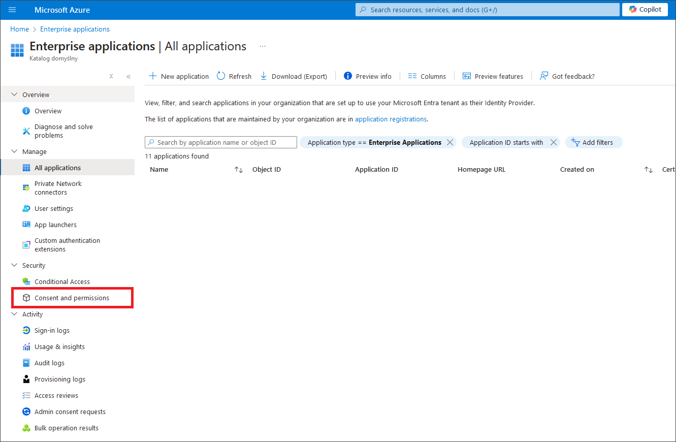 - In the left sidebar, go to Security and click on the Consent and permissions menu.