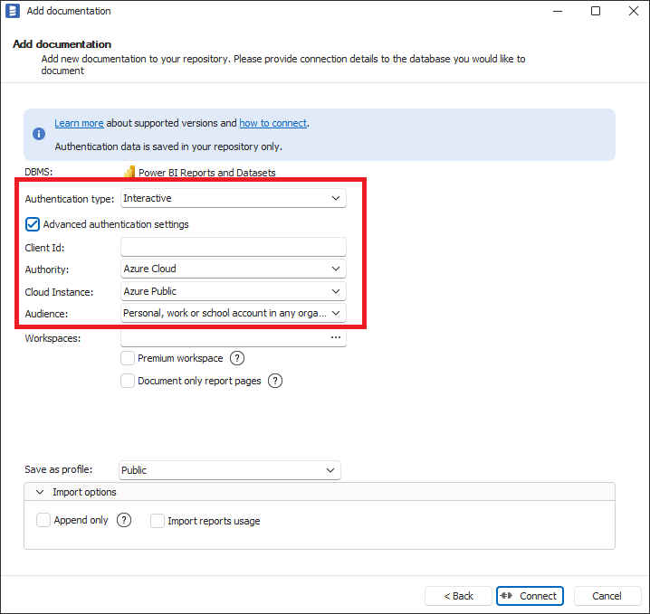 To use interactive authentication using advanced authentication settings. Authentication Type dropdown should be selected to Interactive and Advanced authentication settings checkbox should be checked. Then please enter your Application Registration Client Id to Client Id textbox. How to create Azure Application Registration and where is Application Registration Client Id is explained in Creating Azure Application Registration section below. When you are using not default settings in Application Registration or Azure Cloud Instance other than Azure Public please select proper values in Authority, Cloud Instance and Audience fields.