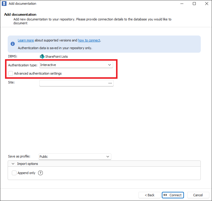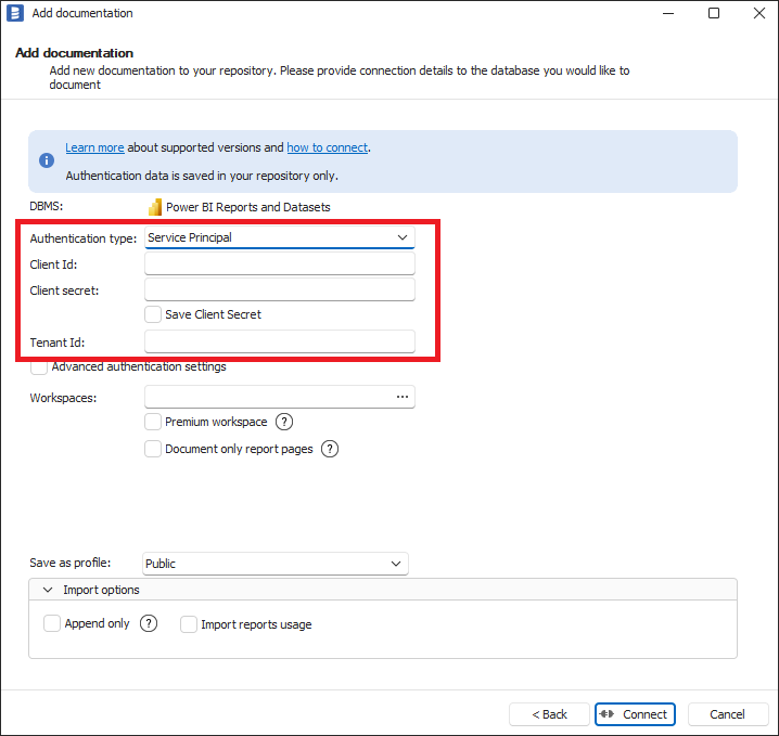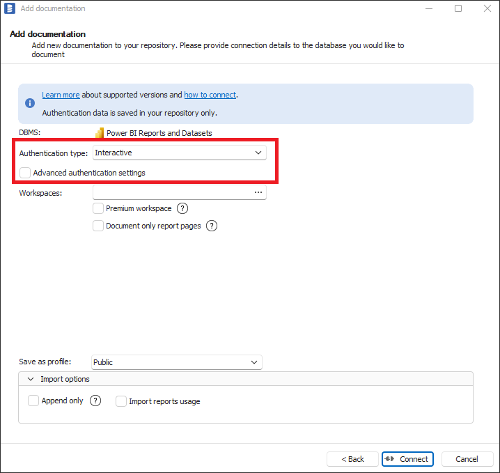 There are two methods to authenticate. The first method is Interactive mode, which requires user interaction each time a data source is imported. Because of this, import tasks using Interactive mode cannot be scheduled in Dataedo Scheduler. The second method is Service Principal, which uses a client secret from Azure Application Registration and does not require user interaction during import.