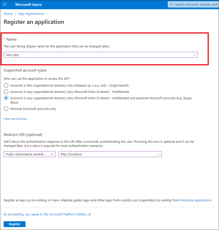 - On the Register page for Name, enter a name of your client application, select supported account types, and Redirect URI as Public client/native, with http://localhost redirect URI.