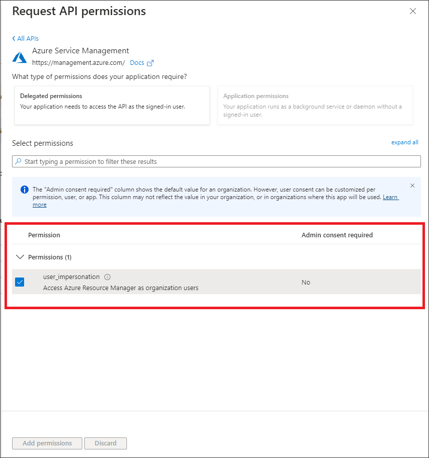 - On the permissions list which will appear after clicking on Azure Service Management check the checkbox user_impersonation and click Add Permissions